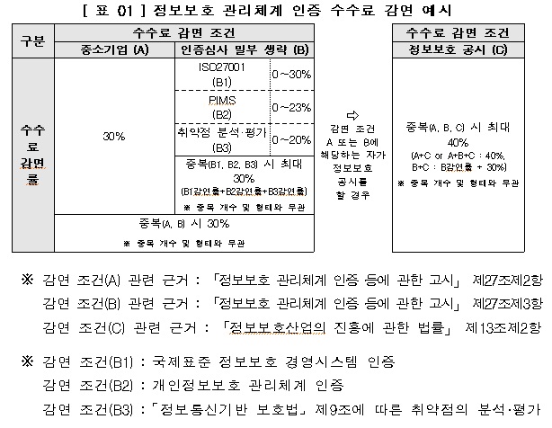 송정수 미래부 정보보호정책관은 “정보보호의 달을 맞아 정보보호에 대한 인식을 제고하고 책임있는 정보보호 투자를 유도하기 위한 정보보호 공시제도의 시행에 앞서, 사전 의견수렴을 위해 가이드라인 잠정안을 배포한다”고 말했다.정보보호 관리체계 인증 수수료 감면 예시.<표제공=미래부>