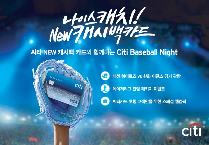 (서울=포커스뉴스) 한국씨티은행은 '씨티 뉴(NEW) 캐시백 카드' 출시를 기념해 9월 3일 고척 스카이돔에서 열리는 넥센 히어로즈와 한화 이글스의 경기에서 '씨티 베이스볼 나이트' 이벤트를 실시한다고 8일 밝혔다.