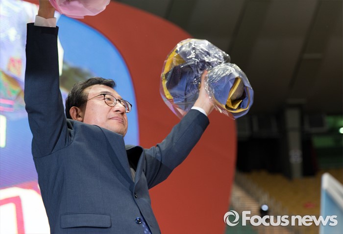(서울=포커스뉴스) 9일 오후 서울 송파구 잠실실내체육관에서 열린 제4차 새누리당 전당대회에서 당대표로 선출된 이정현이 환호하고 있다.