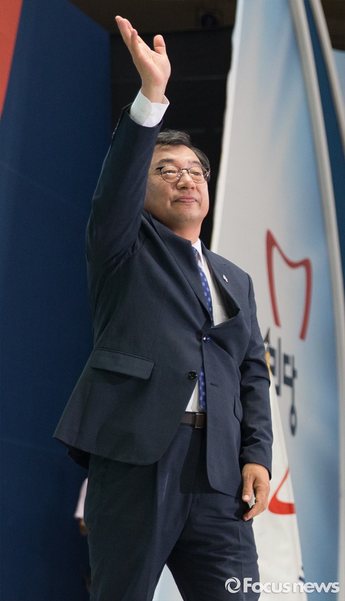 (서울=포커스뉴스) 9일 오후 서울 송파구 잠실실내체육관에서 열린 제4차 새누리당 전당대회에서 당대표로 선출된 이정현이 수락연설에 앞서 당원들에게 인사를 하고 있다.