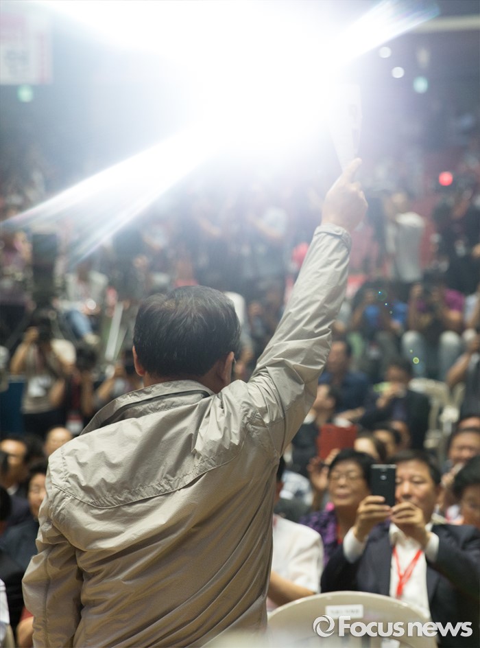 (서울=포커스뉴스) 9일 오후 서울 송파구 잠실실내체육관에서 열린 제4차 새누리당 전당대회에서 이정현 후보가 개표에 앞서 당원들에게 인사를 하고 있다.