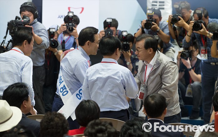 | △ 경쟁 후보들에게 축하 받는 이정현 |