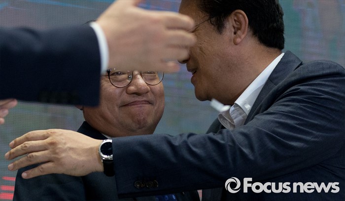 (서울=포커스뉴스) 9일 오후 서울 송파구 잠실실내체육관에서 열린 제4차 새누리당 전당대회에서 당대표로 선출된 이정현(왼쪽) 의원이 정진석 원내대표의 축하를 받고 있다.