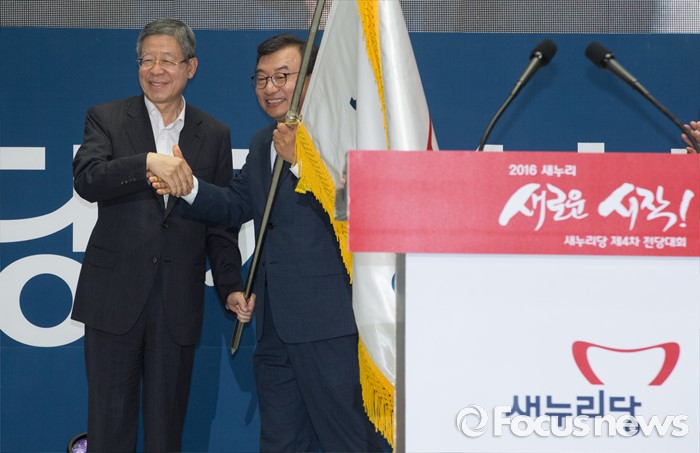 (서울=포커스뉴스) 9일 오후 서울 송파구 잠실실내체육관에서 열린 새누리당 4차 전당대회에서 신임 당대표로 선출된 이정현(오른쪽) 의원이 김희옥 혁신비대위원장으로부터 당기를 전달받고 있다.