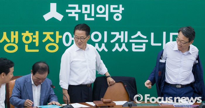 (서울=포커스뉴스) 11일 오전 서울 여의도 국회에서 열린 국민의당 원내정책회의에 참석한 박지원 비상대책위원장과 김성식 정책위의장 등 의원들이 겉옷을 벗고 있다.