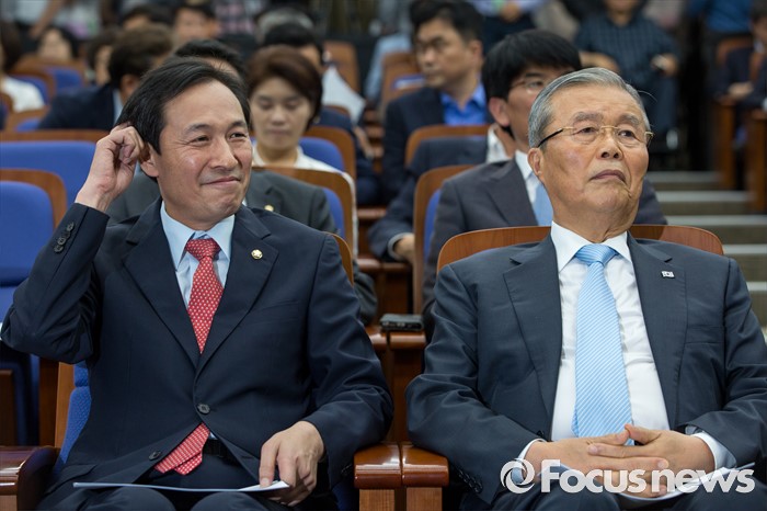 (서울=포커스뉴스) 김종인(오른쪽) 더불어민주당 비상대책위 대표와 11일 오전 서울 여의도 국회에서 열린 의원총회에 참석해 총회 시작을 기다리고 있다.