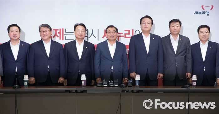 (서울=포커스뉴스) 11일 오후 서울 여의도 국회에서 열린 전기세 누진제 개편 긴급 당정 협의에 참석한 이정현 새누리당 대표, 정진석 원내대표, 유일호 경제부총리 겸 기획재정부 장관, 주형환 산업통상자원부 장관 등 참석자들이 취재진을 향해 포즈를 취하고 있다. 왼쪽부터 이장우, 조원진 최고위원, 유 부총리, 이 대표, 정 원내대표, 주 장관, 김광림 정책위의장.